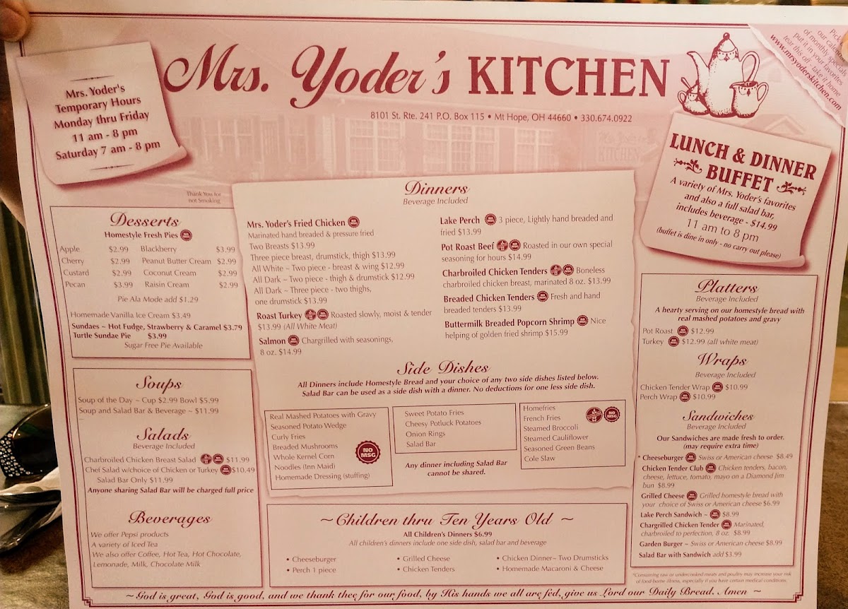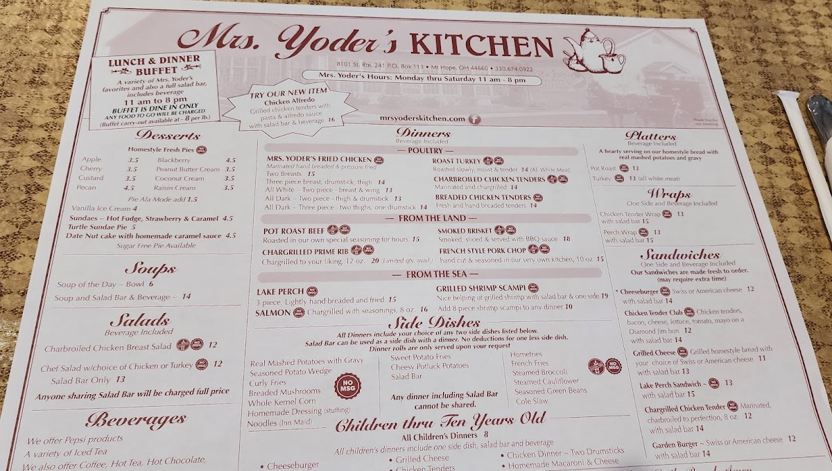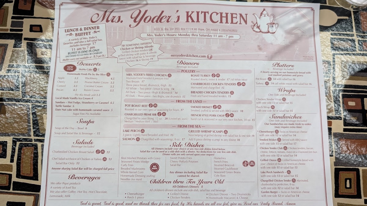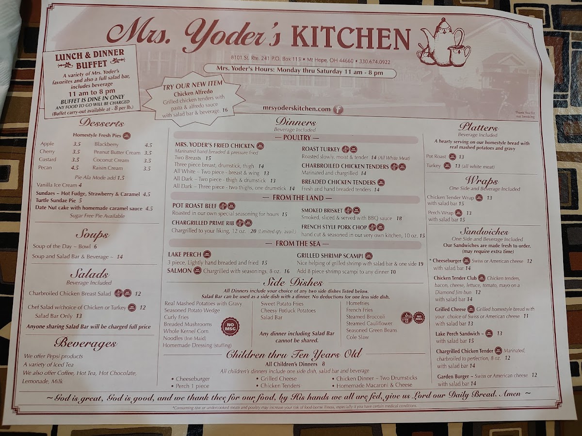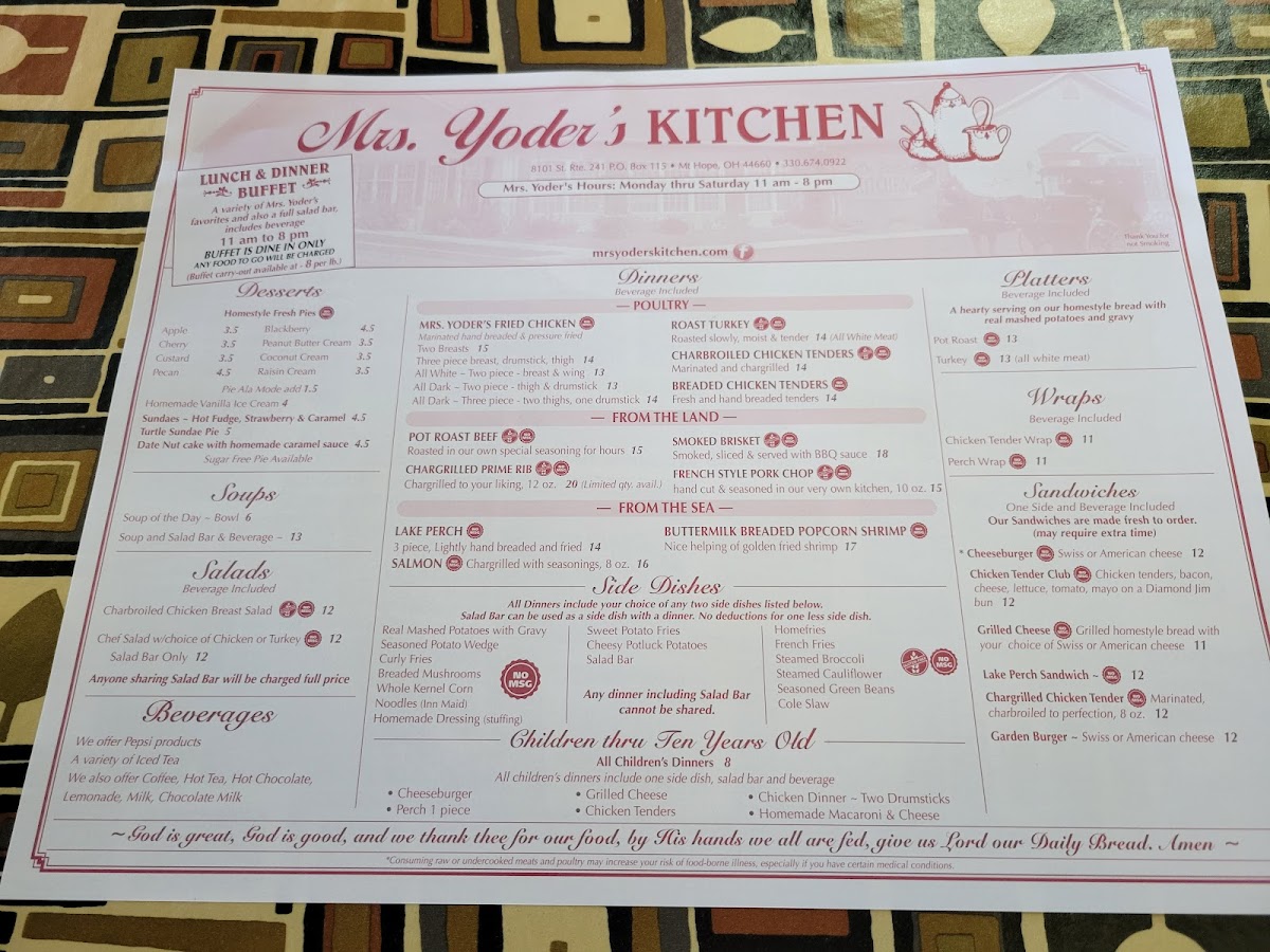 Mrs. Yoder's may not be the biggest buffet in the area, but I can say everything on the buffet is good. There is not one item that we tried and did not like. It is by no means a fancy place it looks like your grandma's house. But in the amish country that's kind of what you want. It's simple home cooking at its best. I will say the fried chicken here is leaps and bounds better than other buffets in the area. The place is small and fills up fast, so do not be surprised if there is a wait for a table. It also has a small parking lot out front. This restaurant is by no means meant to attract tourists but more should probably visit it. It is worth trying while in the area. The buffet here is also cheaper than the other buffets nearby.
