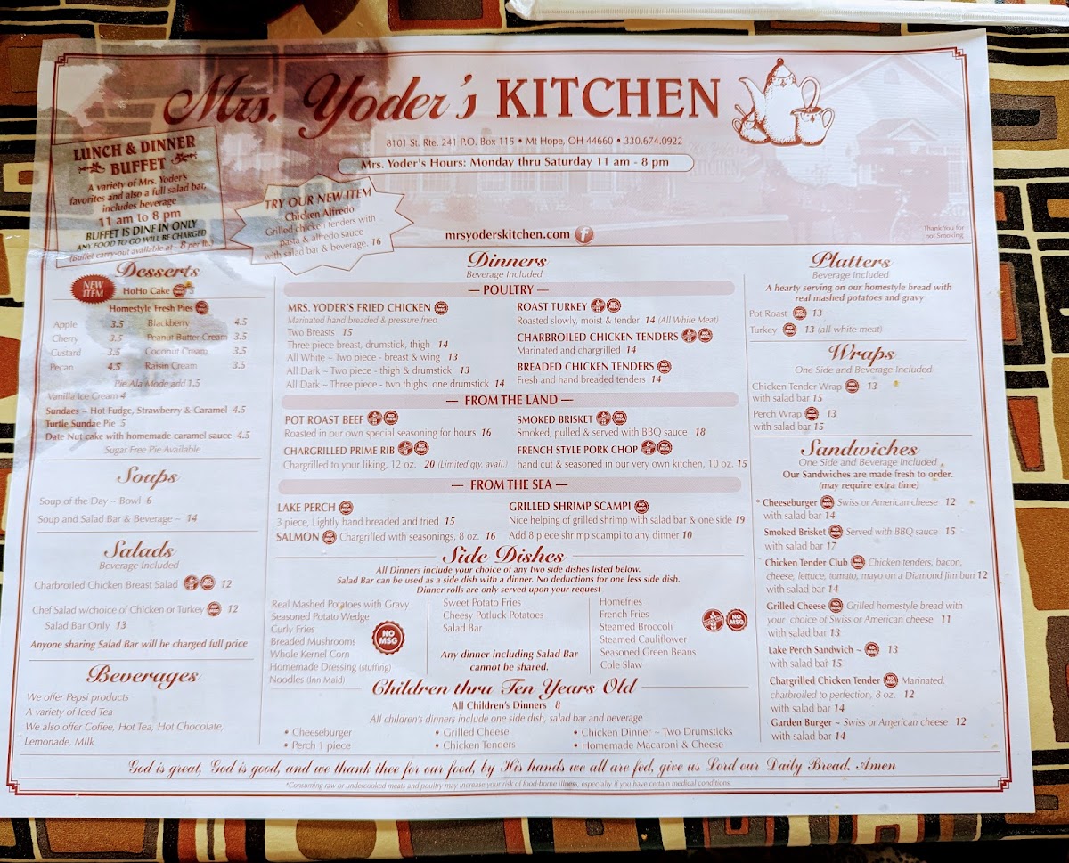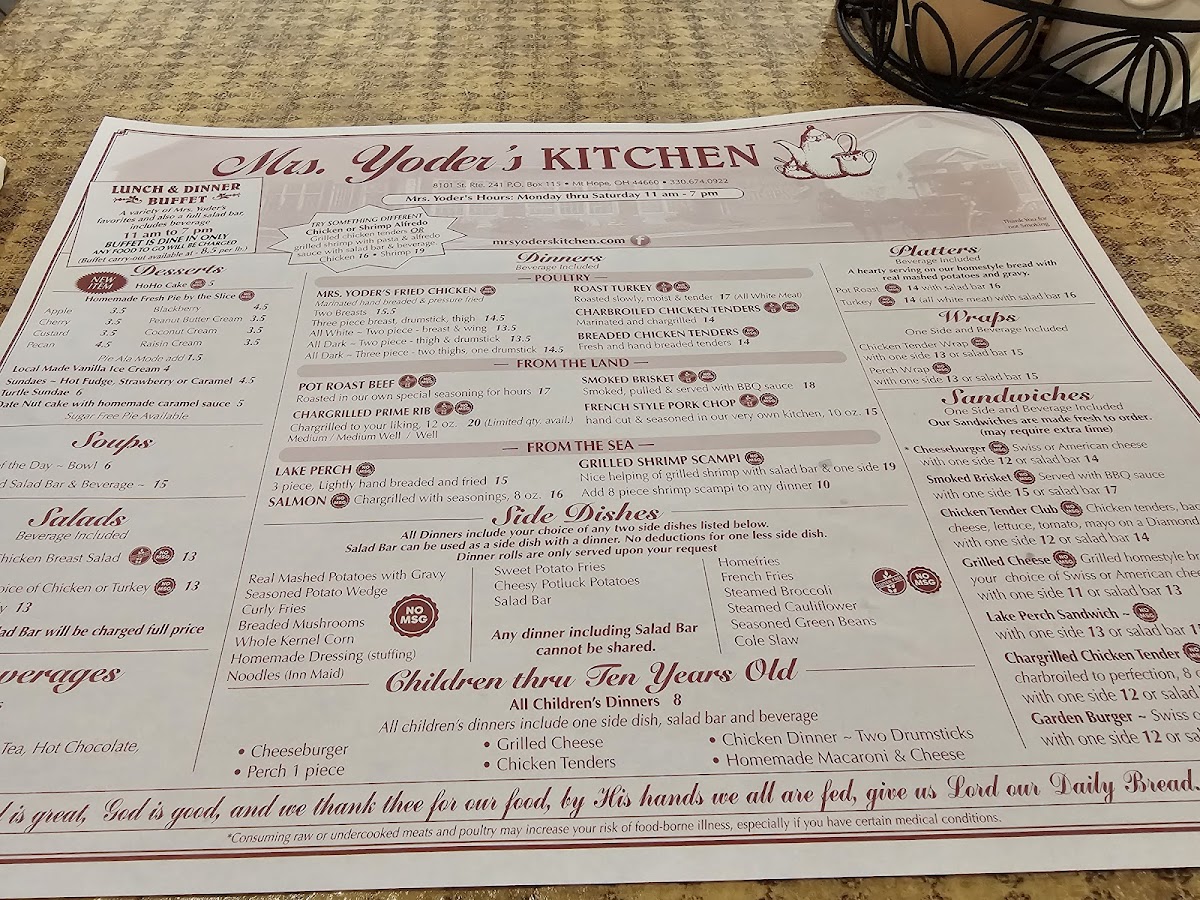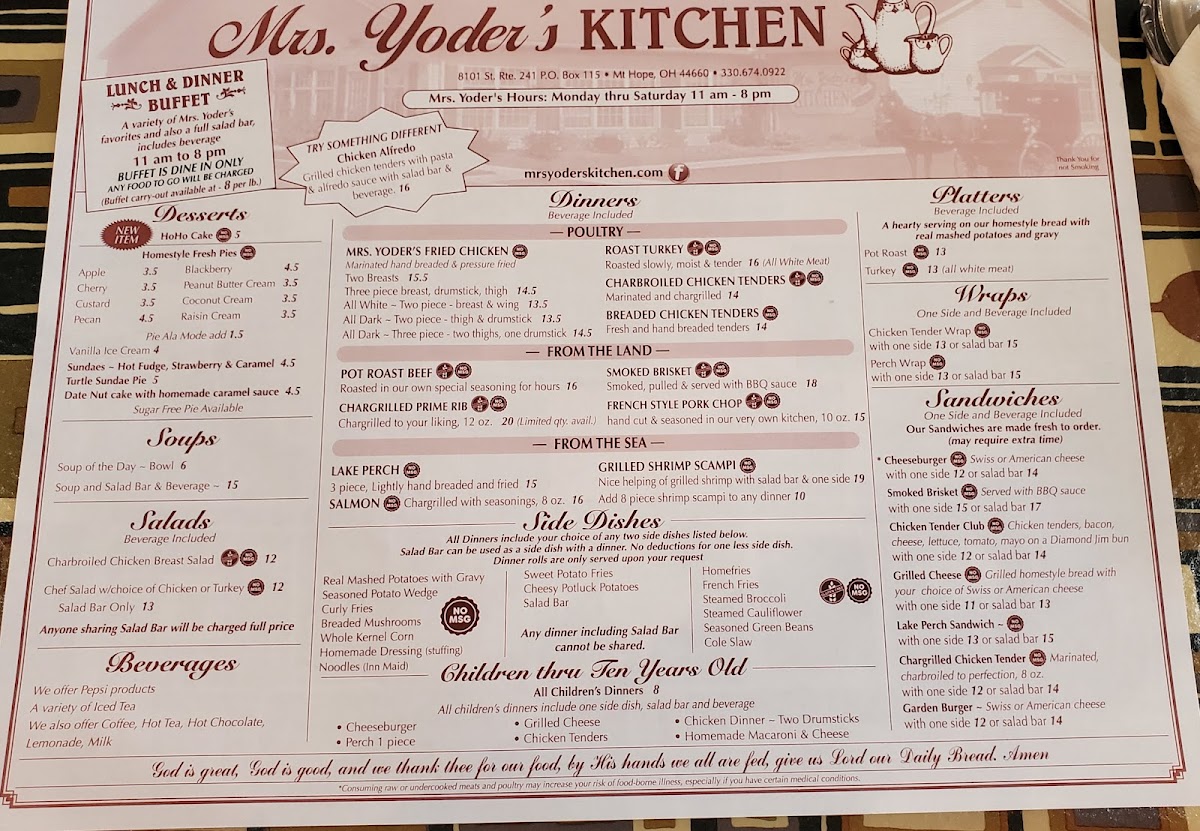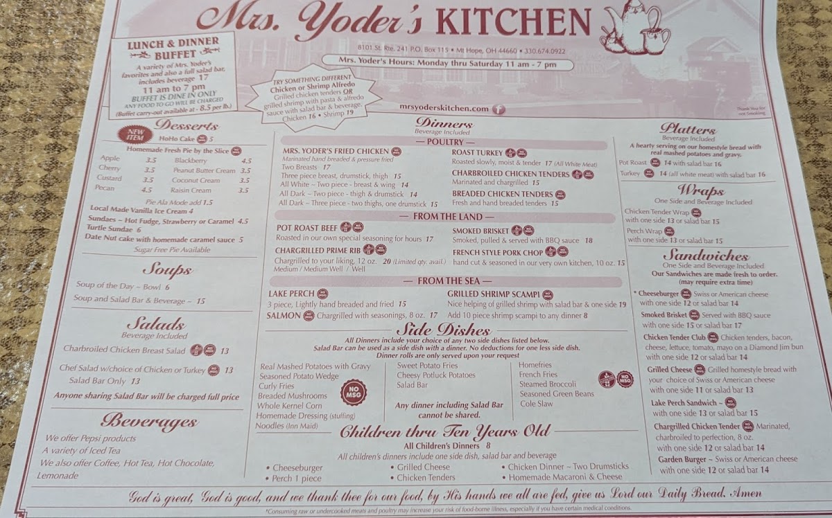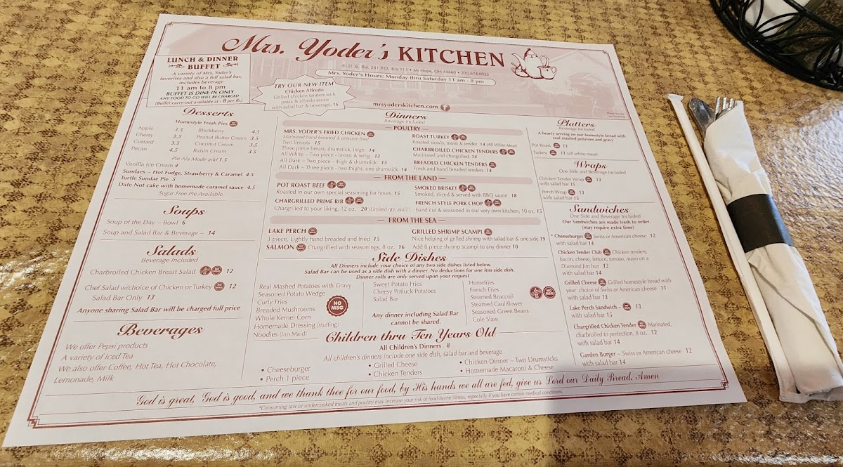 Mrs. Yoder's may not be the biggest buffet in the area, but I can say everything on the buffet is good. There is not one item that we tried and did not like. It is by no means a fancy place it looks like your grandma's house. But in the amish country that's kind of what you want. It's simple home cooking at its best. I will say the fried chicken here is leaps and bounds better than other buffets in the area. The place is small and fills up fast, so do not be surprised if there is a wait for a table. It also has a small parking lot out front. This restaurant is by no means meant to attract tourists but more should probably visit it. It is worth trying while in the area. The buffet here is also cheaper than the other buffets nearby.